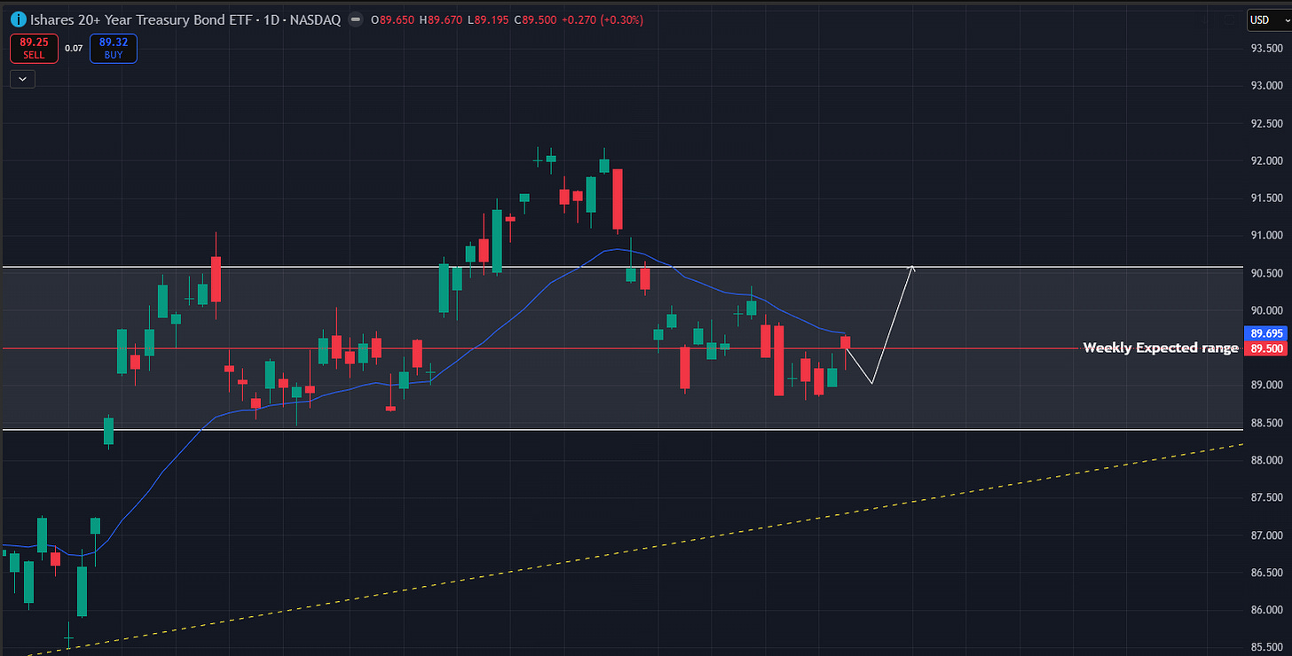 TLT should explore lower prices into Tuesday and then move back toward the upper edge of the range around 90.5 into Friday. Bonds are in a slow transition phase here, not a quick trend.