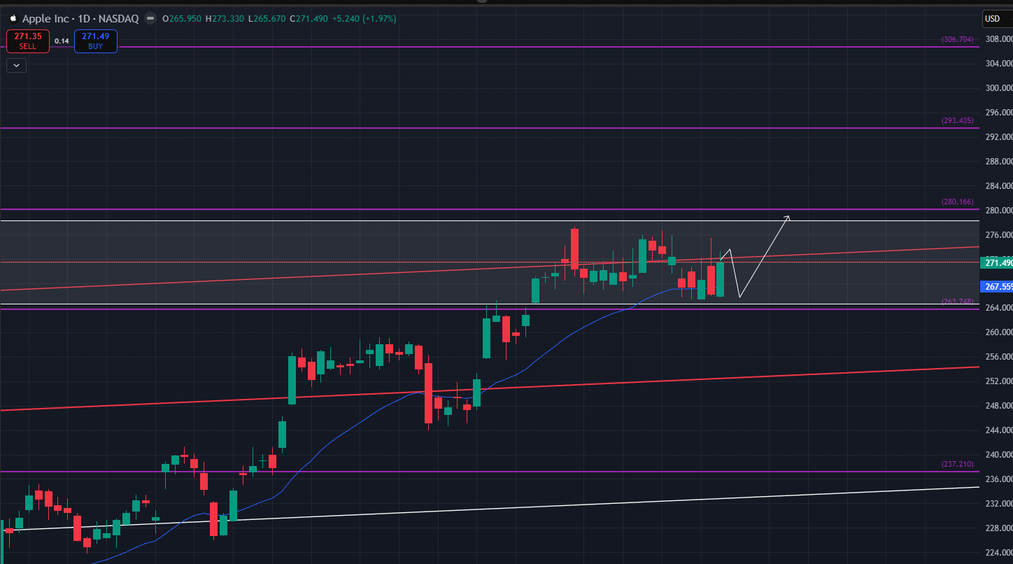 - Long 265 to 270 with stops under 262 targeting 279 then 284.