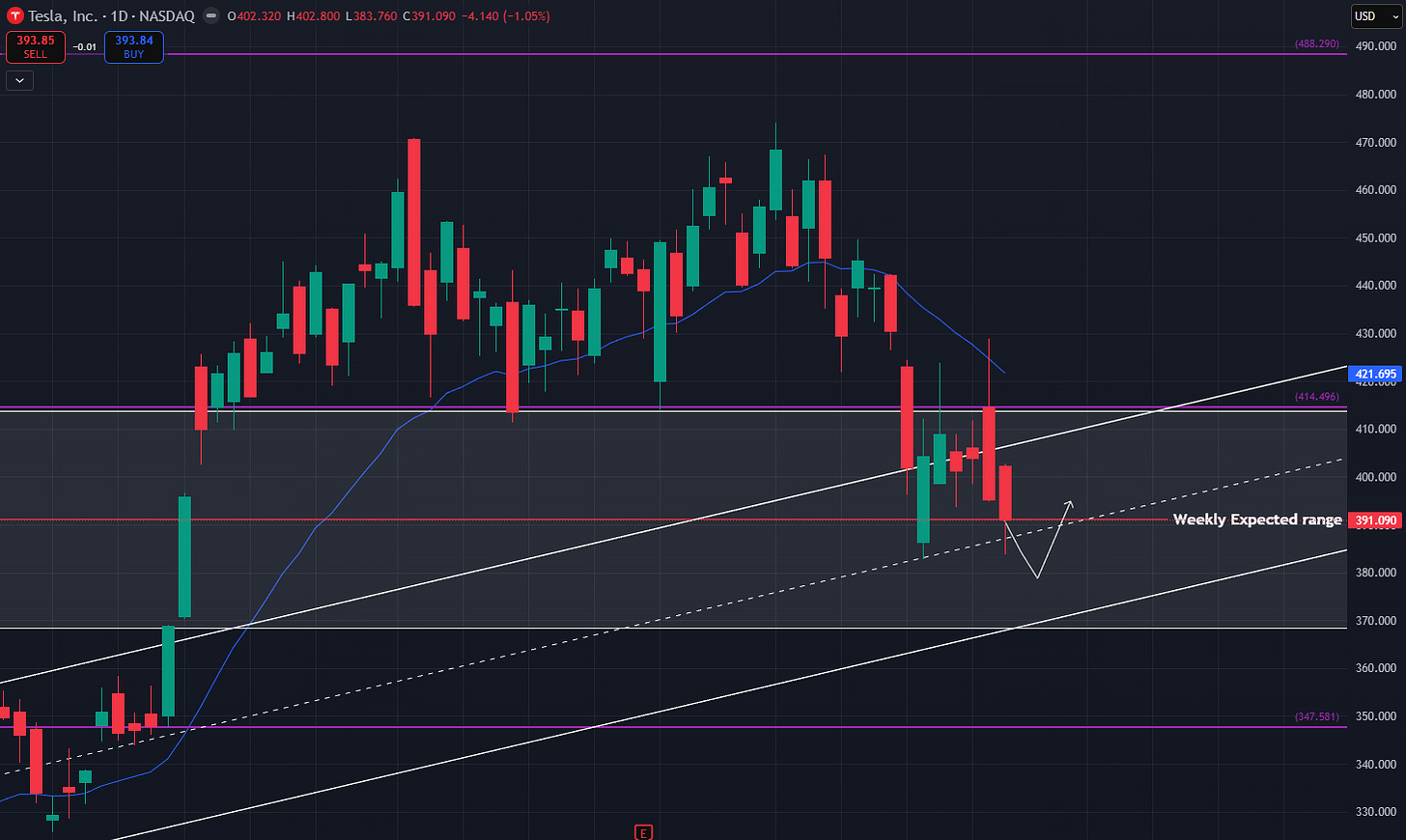 TSLA continues to show no signs of risk-on behavior. This week should be weakness into Tuesday, small recovery into Friday, but still within a bearish longer-term structure.