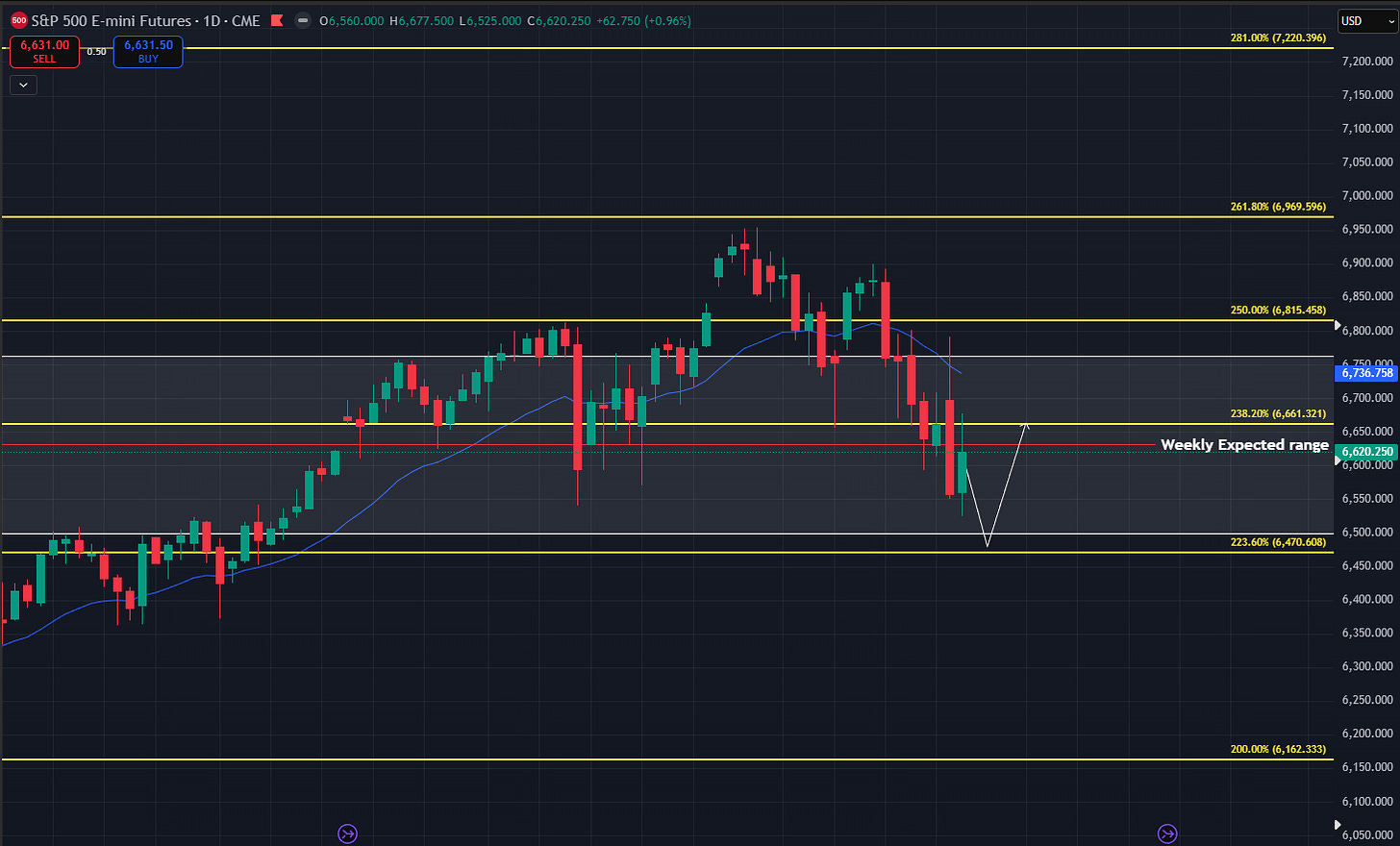 Last week we called ES almost perfectly from start to finish. The drop, the bounce into the midpoint of the expected range, the rejection, the recovery. All clean. What matters now is that ES closed beneath the weekly expected range. This is exactly the scenario I warn about constantly because these ranges are not arbitrary numbers. They are derived from dealer hedging flows, volatility pricing, and option models that reflect institutional pressure. A close under the lower boundary means big players are still being forced to sell.