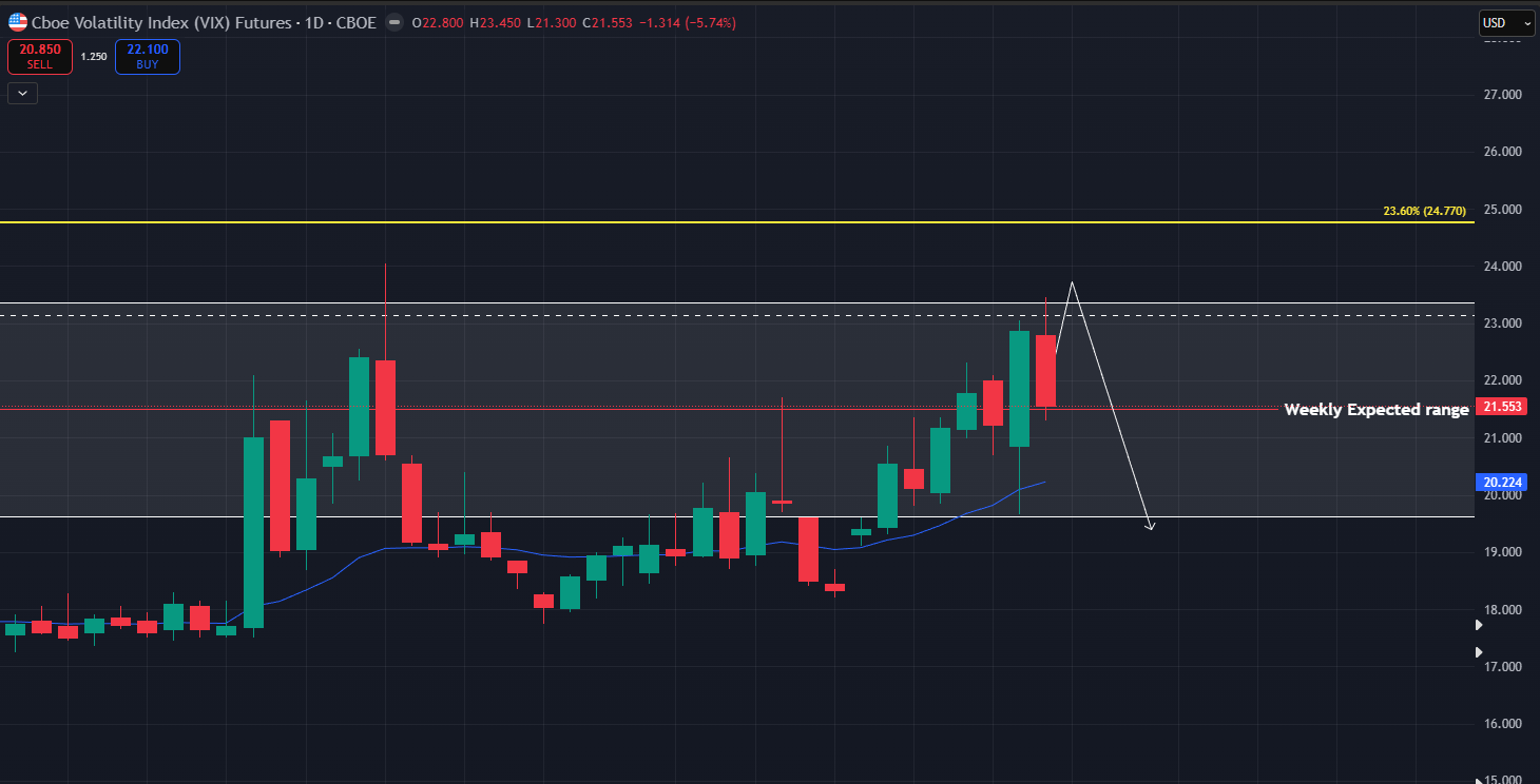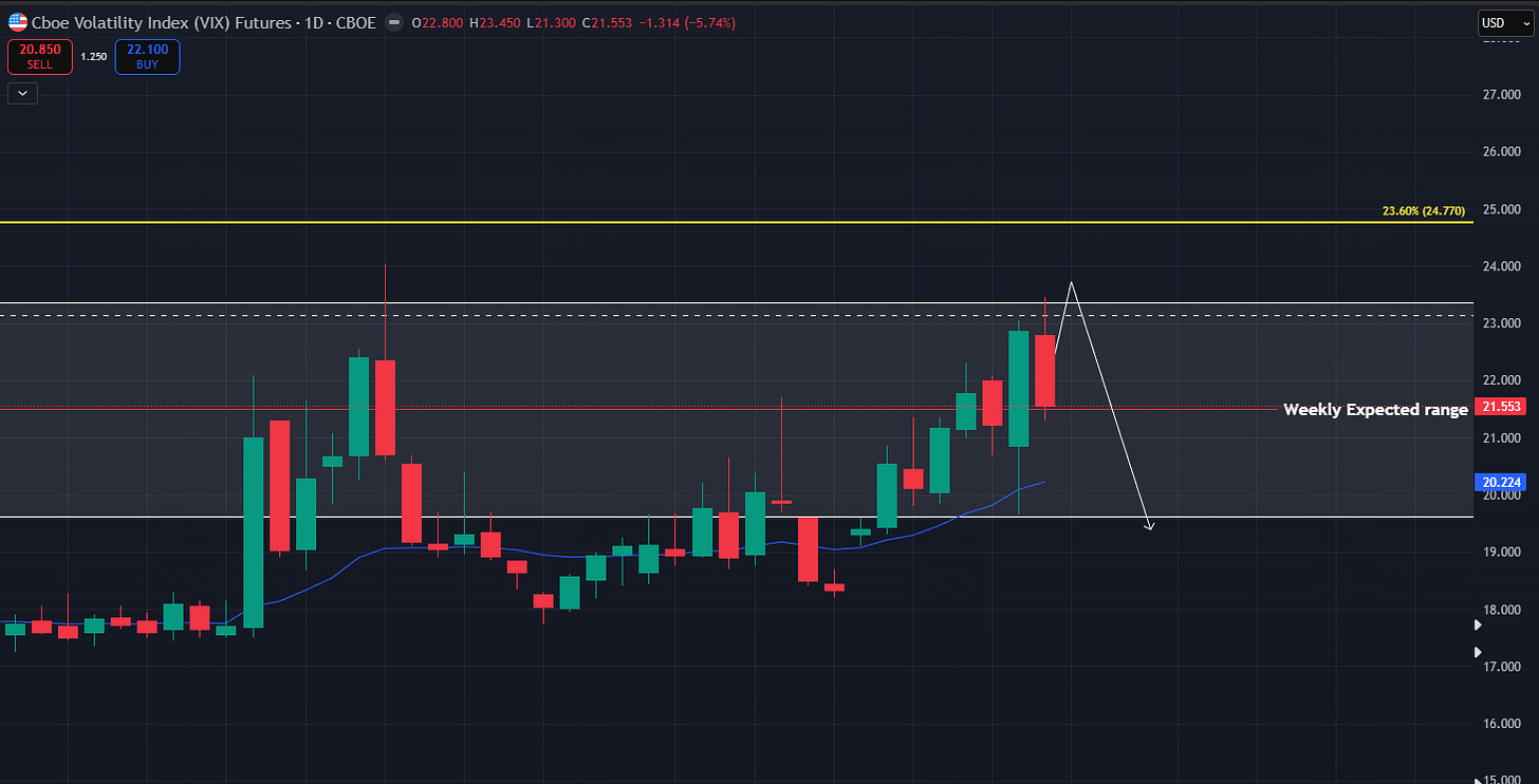 VIX closed above the upper bound of last week’s expected range, which is exactly the type of close that signals continuation in the same direction. I expect another volatility spike toward the upper edge of the range early this week and then a slow bleed into Friday. This lines up perfectly with the equity roadmap described above.