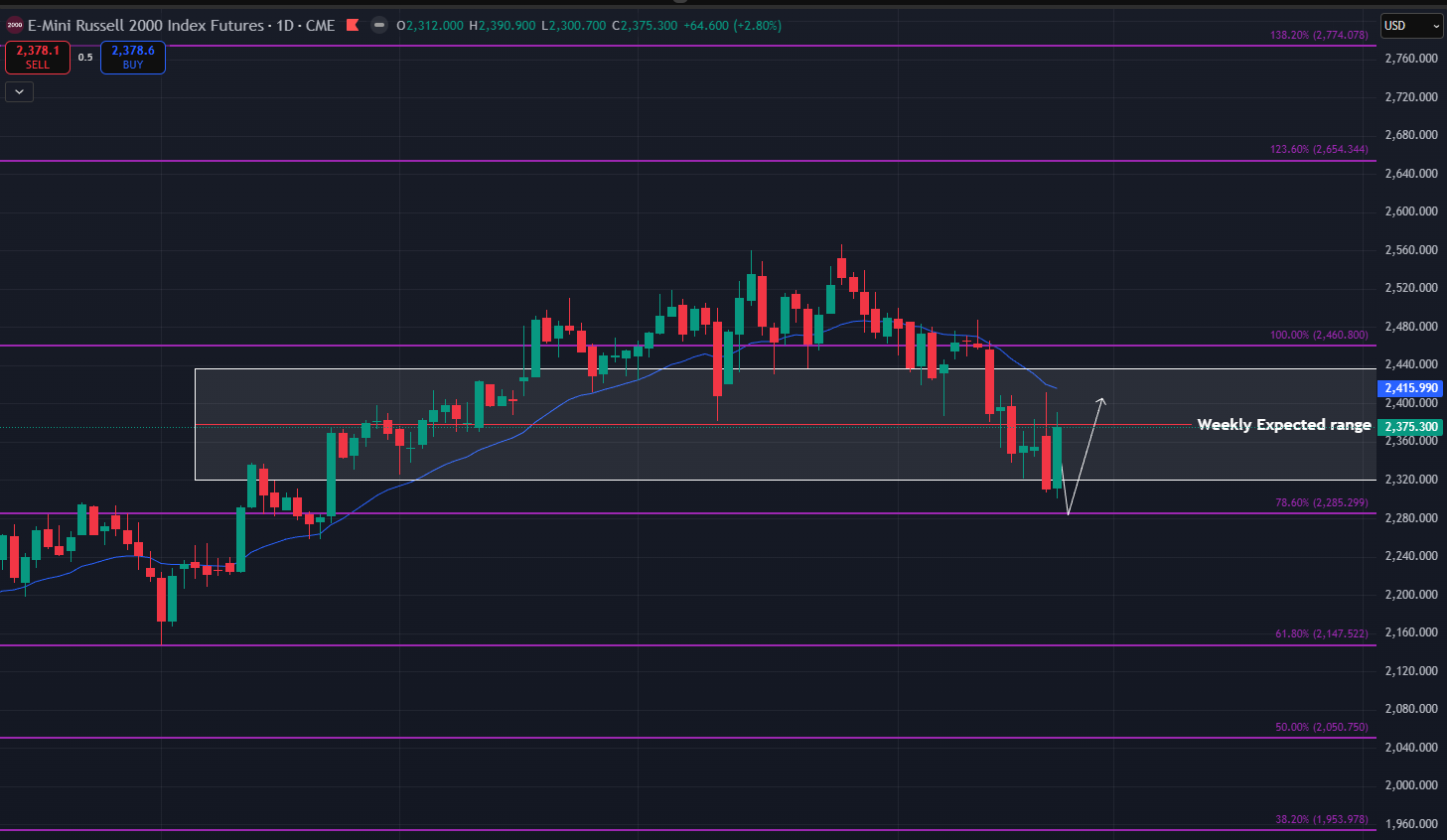 Monday should give weakness, ideally tagging the 2285 level or giving a false breakdown under it. From that zone I expect a move toward the 2385 to 2415 range into the end of the week. The Russell is still a structurally weak index, but this week looks like a controlled bottoming attempt.
