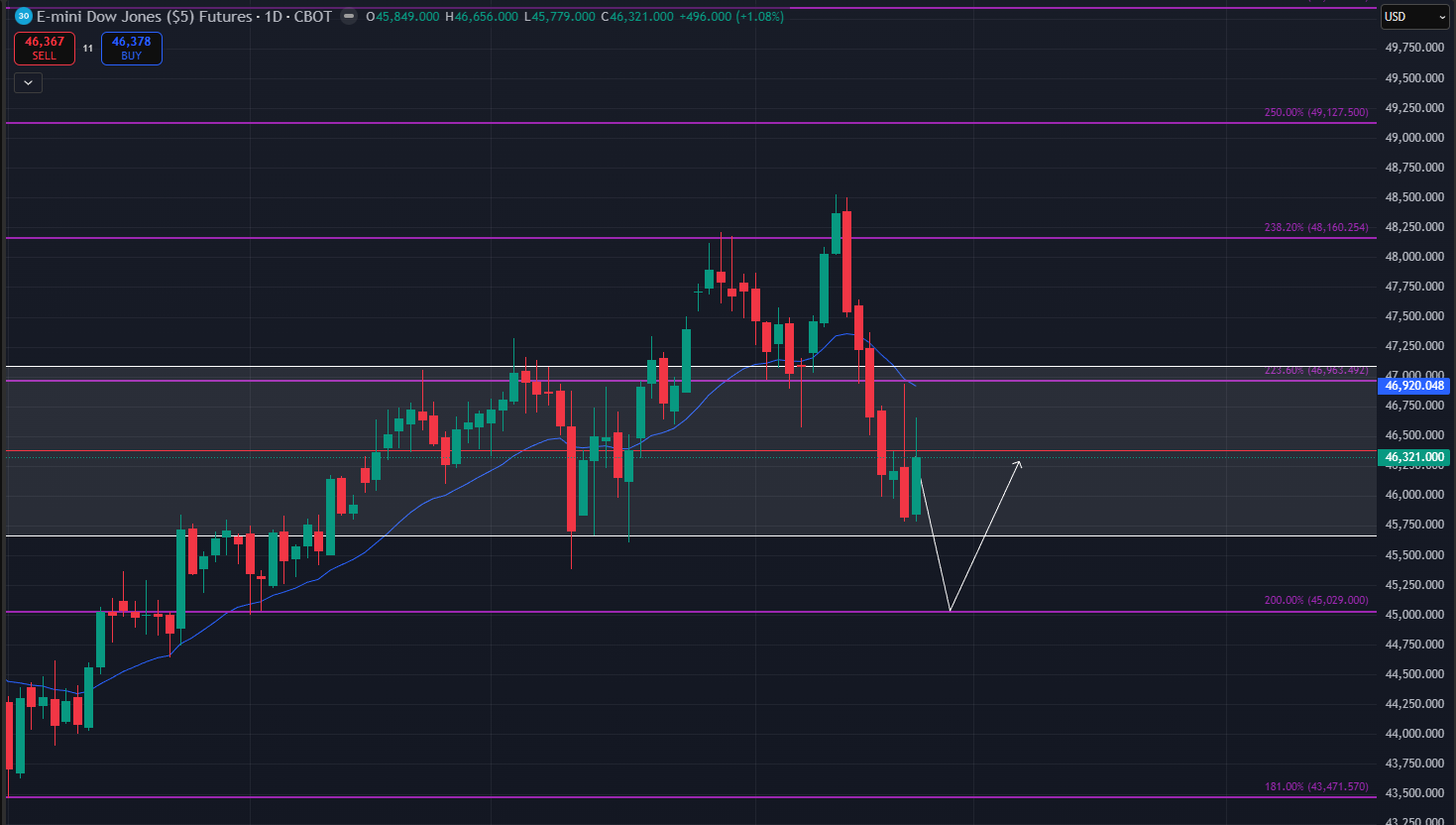 - Long 45900 to 46200 with stops under 45600 targeting 46900 then 47400.