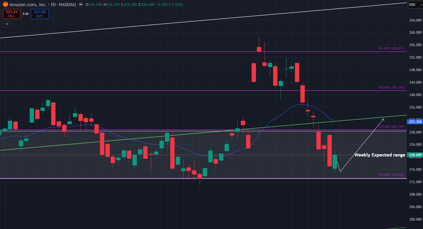 Amazon is setting up a very solid bullish swing. I want weakness early week and ideally a test near 213. From that zone, I want to see a bounce toward 228.75 and likely continuation afterward. Early-week dip buys should offer strong risk-reward.