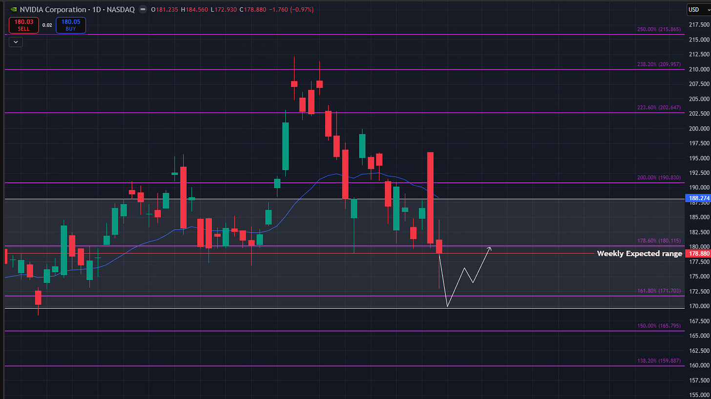 Our read on NVDA earnings played out exactly right. The algorithm pointed to a rip but the structure pointed to a selloff, and the selloff won. Now for this week I expect downside Monday, ideally a false break of the 171.7 level, then a move toward the 176–178 range. NVDA remains buyable only if 180 continues to hold.