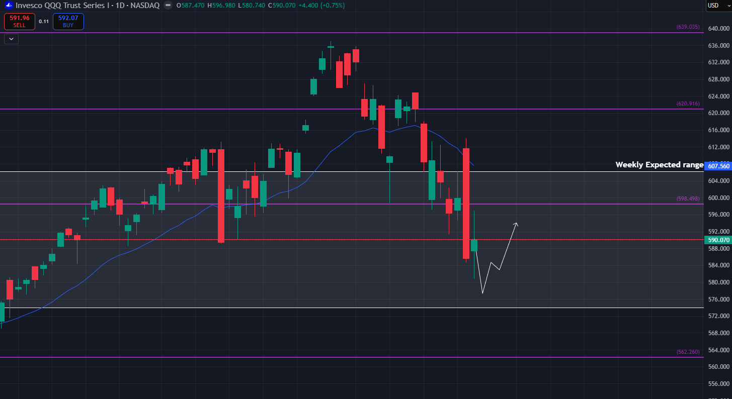 Downside early week, ideally into the 573–578 range. From there, a slow grind upward into Friday. There is a minor chance of a Wednesday pullback, but as long as it stays shallow, the end-of-week continuation stands.